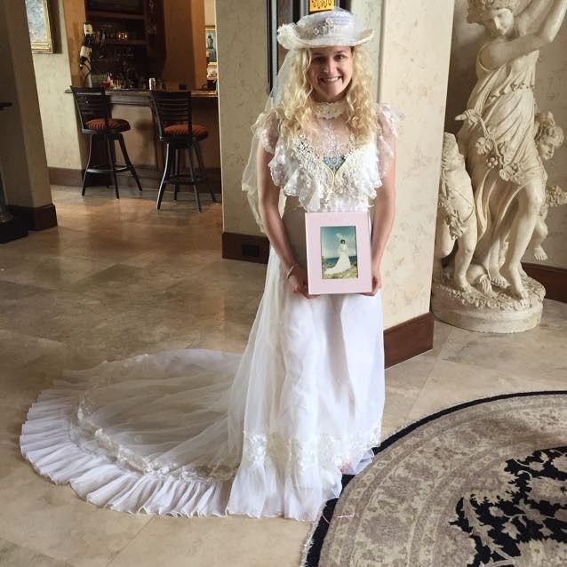 Tried you mother's wedding dress on? Just found this pic from a couple years ago when I was helping my mom move. We found her dress in the process, so I decided to try it on. She was tiny! Couldn't even zip it up all the way. Definitely not the style...