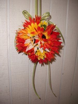 Hey Ladies! I am in the process of making kissing balls/pomenaders to hang from shepherd hooks to line my aisle. I will have them in pink, orange and white... right now the big ? for me is where to place the bow on them... top or bottom... see pics...