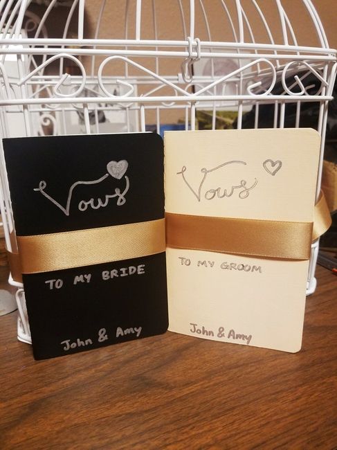 Is anyone else using vow books? I made ours with little black sketch books from walmart, some peach colored paint, metallic marker, and ribbon. This only cost me $2.80 and less than an hour of work. I highly recommend trying it.