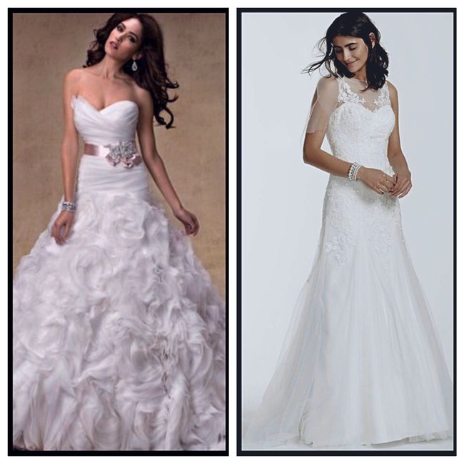 My dress order got cancelled because my mom forgot to pay for the order (she just changed jobs, is selling her house, moving, etc). I tried back on the original dress (first one) and another similar dress. Now I'm torn! We need to reorder ASAP...