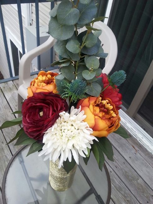 Just finished a mockup of a centerpiece ( 4 or 5 clear glass votive candles that I forgot to put around the vase before taking the photos). I wanted a tall centerpiece since our venue has high ceilings, but we couldn't really fit a florist into our...