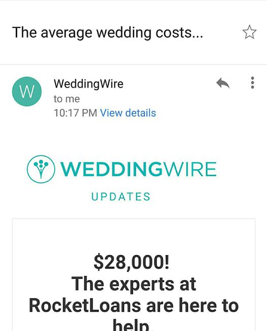 No wonder many people start weddings off in debt. I have been spammed by these emails all day. Its not a way i would want to start out my married life. Hopefully no one does it! I work for a bank and see too many people fall down the debt hole. Eta....