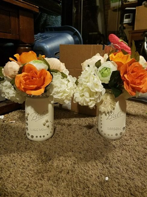 I was at work and my mom sent me this for an idea for centerpieces. Apparently she bought a bunch of mason jars at a garage sale & began decorating. I kinda like them except I'm thinking of adding more green to them because my colors are purple &...