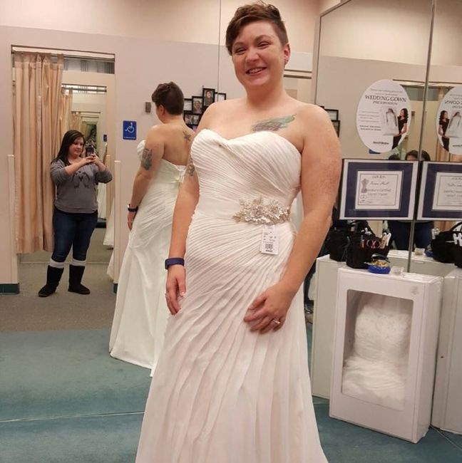 So, I had my third dress fitting today and I LOVED my dress on and in person! It fits well and is comfortable! At the end of my appointment, I asked my aunt to snap a couple pictures for reference with different jewelry options. I looked terrible...