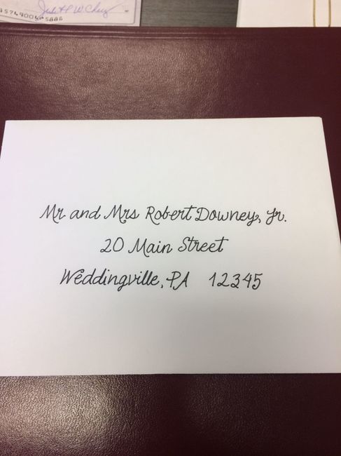 Im practicing addressing my envelopes.. I need a better pen and straighter lines but I think it's okay. Needs a little work. I slanted at the end..grrr. Our calligrapher's(doing our signs and few other things) quote was just too much.