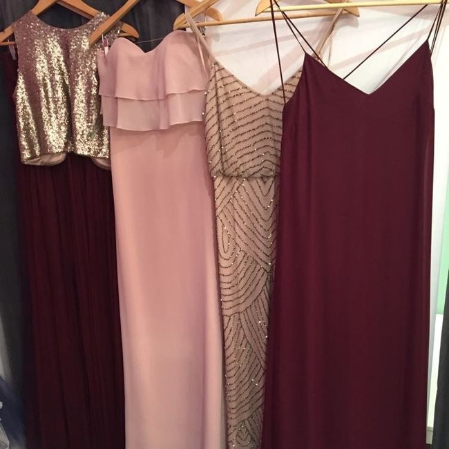 We're going to look at tuxes today, and we're having a hard time choosing a tuxedo color. What would you pair with this combo of BM dress colors?? We're leaning toward maybe navy with a burgundy tie? And blush ties for the GM? Help!