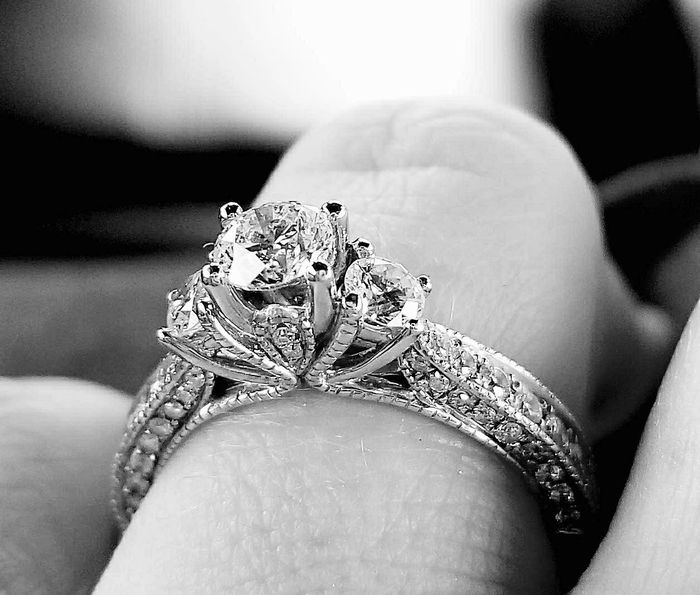 Post your engagement rings! With or without wedding bands I could look at them all day. I just gave mine up to get sized and it is taking a long time, 2 weeks thus far. Here is mine, taken right as I was dropping it off. (Excuse the blurry photo,...