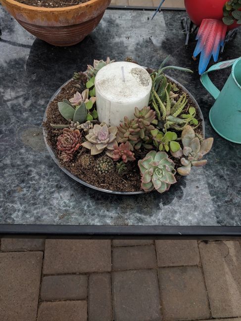 2785 days agoHi all! My FH has been working on our centerpiece ideas. The one with the candle is the original one he made months ago (which, if we went with that, would be more full with groundcover and with an LED candle since we'll be outside). The one with the...