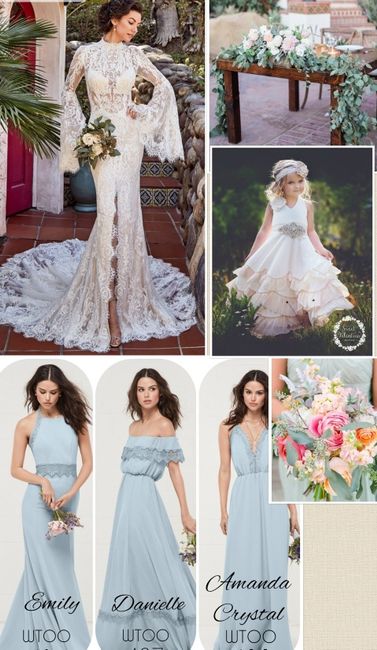 I am doing a beach wedding, so I am thinking of blues, greens or grey. They don't all have to be the same color or style. Just wondering if you would mind showing off yours?