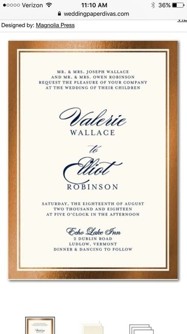 I have been searching for days for a copper colored foiled wedding invitation. Help! I found one on WPD that was just about perfect but the template won't work and it doesn't come as a suite. Anyone else have a navy and copper theme? Where did you...