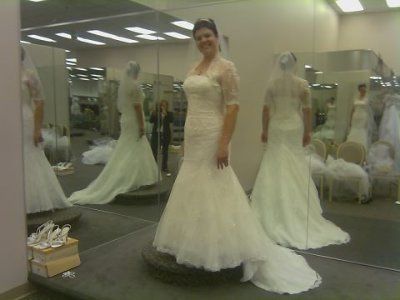 I just got back from David's Bridal, and I tried on some of the Oleg Cassini dresses. Besides being pretty darn proud that I fit into a size 12, I really loved them. Here are some pictures! I kind of like the second dress better, because it's not...