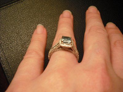 I love love love my ring. I am just loving the fact that he had to have it made because I wanted a colored stone in the center, so underneath the setting there are two hearts that he asked the maker to put in! It is adorable so I stated that it...