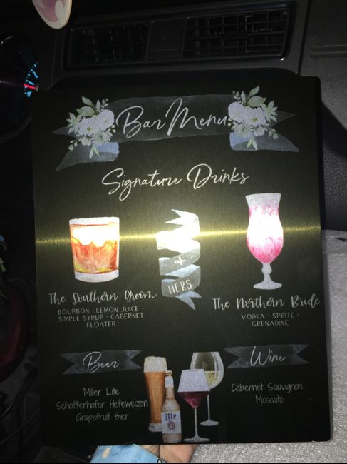 Does anyone have pictures of their bar signs? We are having an open bar and I downloaded a super cute template from etsy with our signature drinks, the wine, and beer available. But I also wanted to let the guests know what liquor is available since...