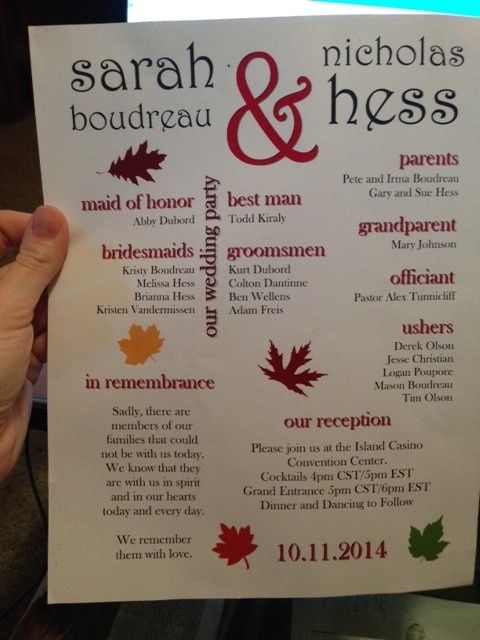 I'm debating doing a single page program printed front/back. To get all the info and it be readable it seems I will need a 8.5"x11" page. Think this is to big? Most of the weddings I've been to is that size folded in half. I was leaning toward doing...