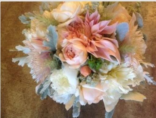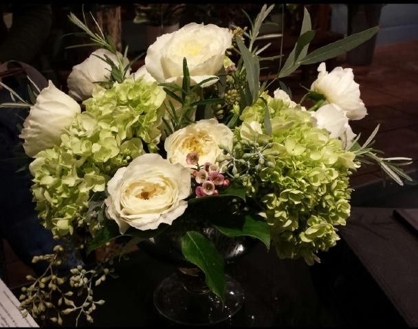 So I had my final meeting with the florist yesterday and this is a sample of my centerpieces. We have 9 tables, and each with have a centerpiece with green hydrangea, eucalyptus seeds, dusty Miller, herbs and foliage, and then highlight one flower....