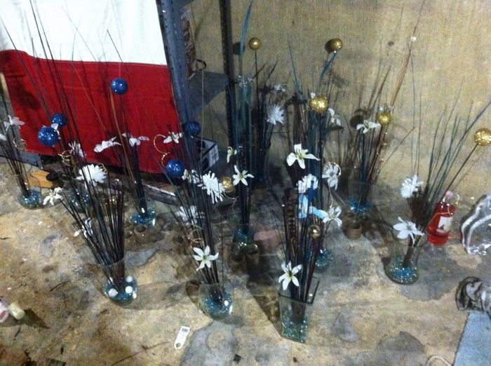 i pondered for a long time about what my centerpieces will look like and I went to the DOLLAR STORE and found random items, (tall grasses, christmas balls, glittery things, and plucked flowers off the stems) and i put them together and came up with...