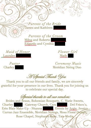 Working on my programs today and am interested in seeing what yours look like. Also, I've noticed on some of the sample programs I've been looking at have listed "Signing of the Marriage License" as an event right before the recessional. I have never...