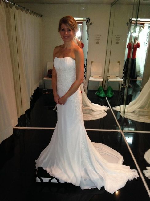 First fitting today in Miami, dress was too big so they are taking it in.Was able to try on the dress with the flower necklace I'd posted about yesterday. Thanks for all the votes, I think the flower necklace slightly outwon the single pearl drop so...