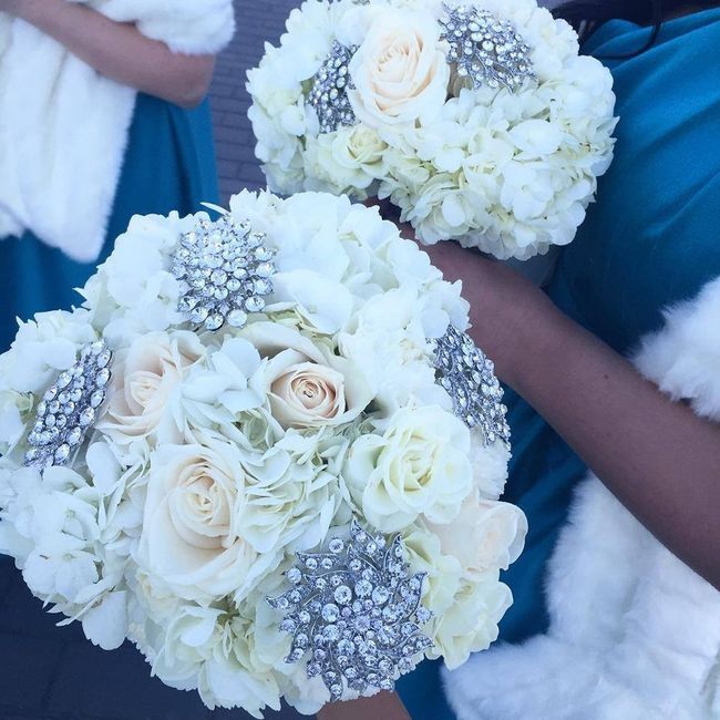 So I am doing a standard wedding flower bouquet, with roses and greenery from my parents backyard. We are adding in lots of sparkly elements and silver touches, which got me thinking about brooches in bouquets! I love the idea of having 4 or so mixed...