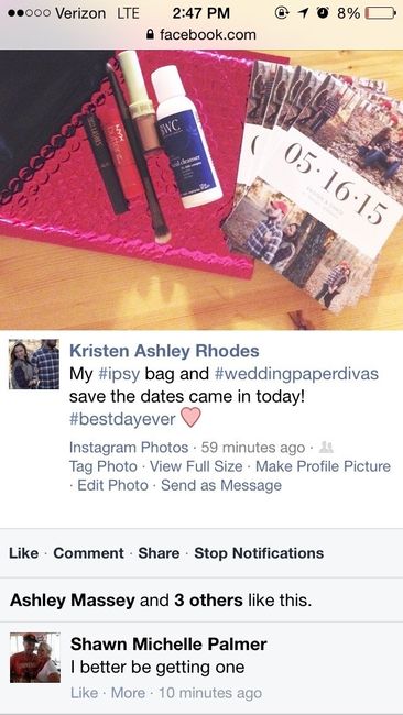 I heard the advice on WW about not putting wedding stuff on facebook but just didn't listen.. I got my IPSY bag and save the dates today and just couldn't contain my excitement and put it all on Facebook and OFCOURSE my dads ex girlfriend had to...