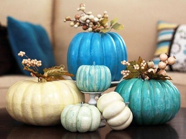 I finally made a mock-up of the idea I've had for our centerpieces (waiting on a white tablecloth and for real pumpkins). They were a concern to me because we are having family style dining and I wanted there to be room on the table but not look...