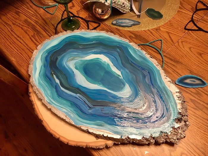 We’re doing 5x 10” round cakes of different flavors instead of a traditional tiered cake. We planned on putting the cakes on various stands and platforms and I painted some tree slabs to look like geodes, to fit our theme, but sadly I got the cake...