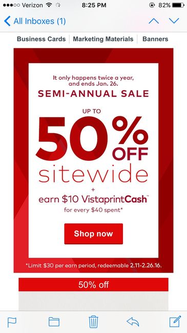 For anyone needing to buy invitations this month, I just got the email that VistaPrint is starting their Semi-Annual sale. A lot of styles are up to 50% off.