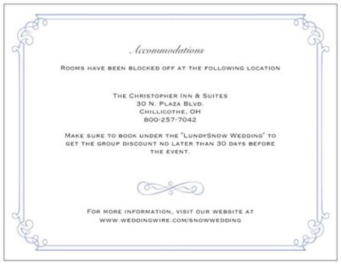 Okay don't kill me - i know i already posted about food on the RSVP card. I'm ready to pull my hair out! I am trying to figure out how to word the accommodation card for the room block. I have found 100 different ways to do it online but this is the...