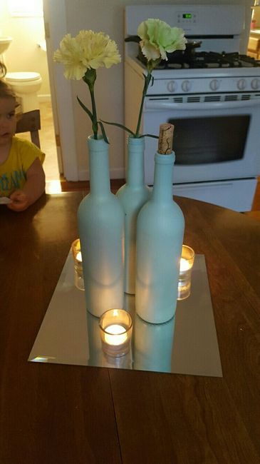 This is essentially what it will look like on the tables. We plan to put a glossy top coat on the wine bottles, and the table number will be in the cork. We are only planning to have 1 or 2 flowers in each bottle. So this is pretty close to what it...
