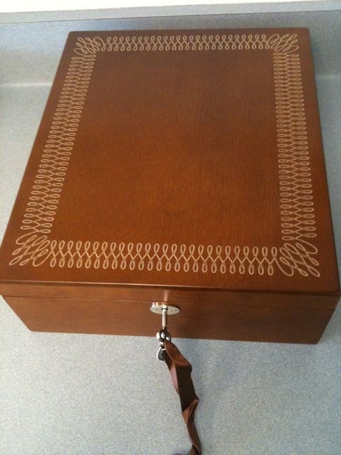I am so crazy excited about it! It is so gorgeous. So glad i chose this one, it came with the glasses one says "i do" and the other "i do too" and beatiful stationary for the love letters. It has a very nice scroll design on the lid too. there are...
