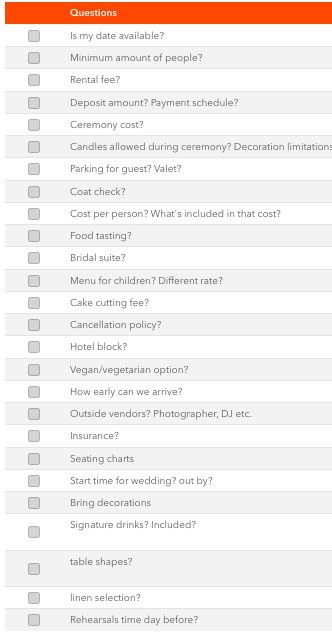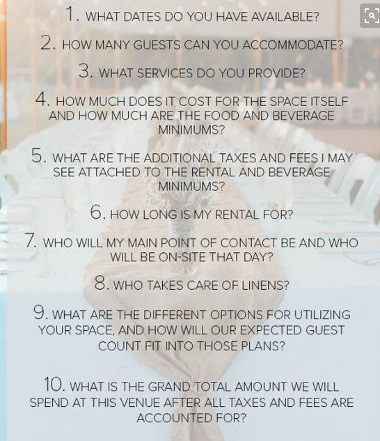 My FH and I are looking at venues later this week. I was wondering what would be some good questions to ask or if anyone has things they wished they'd asked their venue before picking a place. Thanks!!!