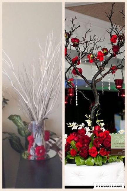 As I've mentioned before, FH's aunt is DIYing a lot of our decor. One thing I specifically wanted was a little tree with red flowers (matching my bouquet) for the guest book table at the reception. The pic on the right is what I want; the left is...