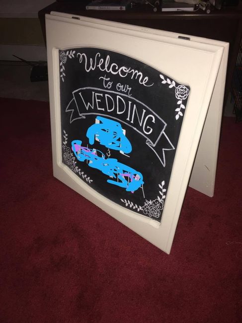 I couldnt find any large chalboards for under 50ish dollars or more. However, we were at ikea for some centerpiece elements and noticed their children's easels were on sale for $15.99! After a little love with some leftover house paint its wedding...