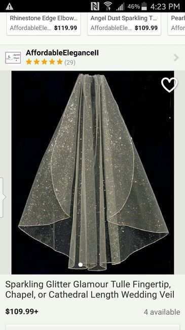 On your veil? I have a few options on veils just from the shop I got my dress from (haven't shopped around much yet). 1. Borrow my sister's double layer tulle veil with a satin from and small rhinestones (if oxiclean de-oxidizes it) 2. Buy a similar...