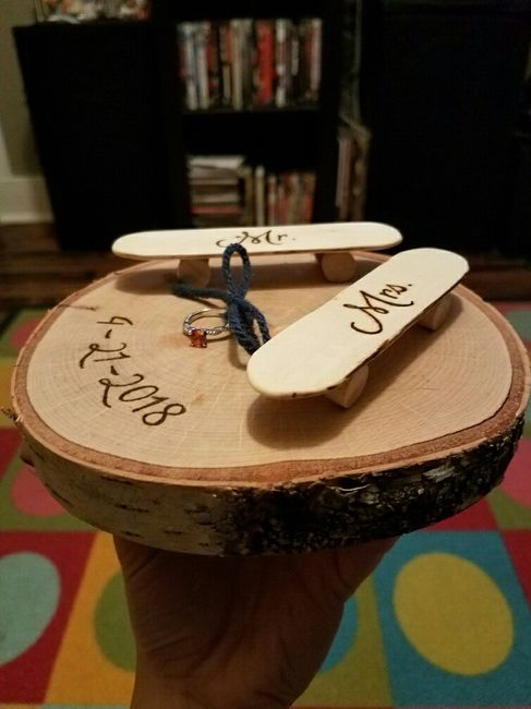 Just thought I'd post my finished ring bearer "pillow"; found it on a website but I knew I could make it for cheaper. I love how it turned out. Cut out and wood burned little skateboards and glued them on a small birch slab. (Skating is my FH hobby...