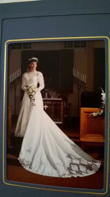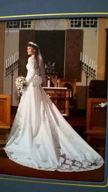 Apparently my FMIL's wedding dress is too small for her daughter (who is getting married 4 months before me) and she offered to let me try it on when FH and I visit next week. I attached pictures of it and I think it's beautiful (aside from the bow...