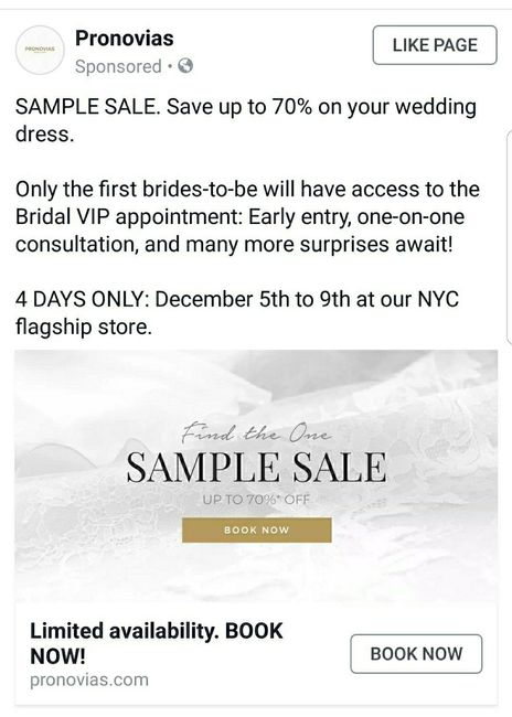 Not sure if someone posted this already but an ad for Pronovias' sample sale popped up on my FB feed. I just thought I would share with brides who are interested in the brand. Link to book an appointment:...
