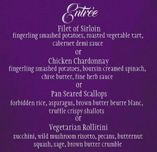 What's on your reception menu? Are you doing plated or buffet? I'm pretty sure I want to go with plated, but having a hard time picking the entrees. I can choose up to 3, or I can pick one for everyone.