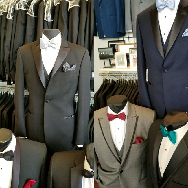 So my FH decided on a brand new tux and went to the shop today...he wouldn't send me pics of him being fitted, but he did send pics of some options and while I loved the idea of the gray with black trim, he is decided on a classic black tux. But...