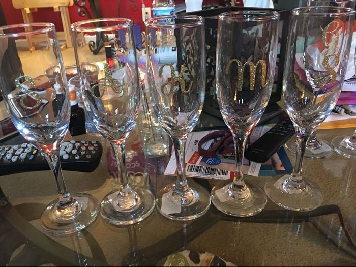 2963 days agoI bought 10 champagne glasses at the Dollar Tree and gold glitter stickers from Michaels. I added the stickers to each glass with the first initial of each one in our wedding party. I think they’re great!