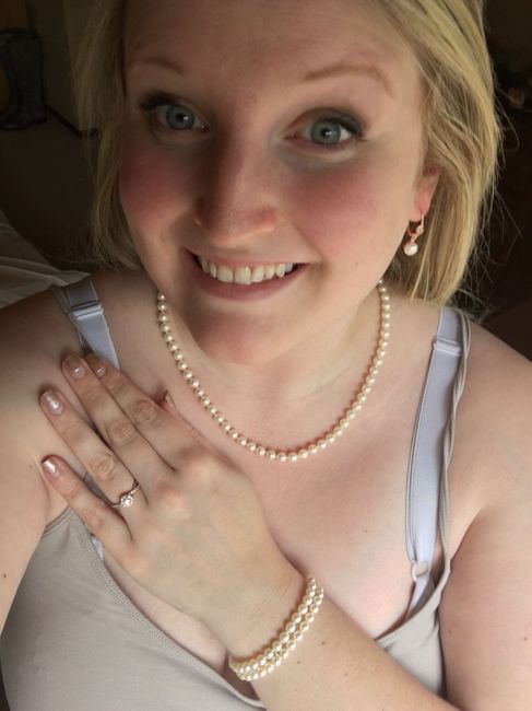 Happy Sunday, everyone! I just finalized my jewelry choices for the big day, and thought I’d share! The pearls are a family wedding tradition for my FH’s family, and the rose gold/pearl earrings tie everything together (my engagement ring is rose...