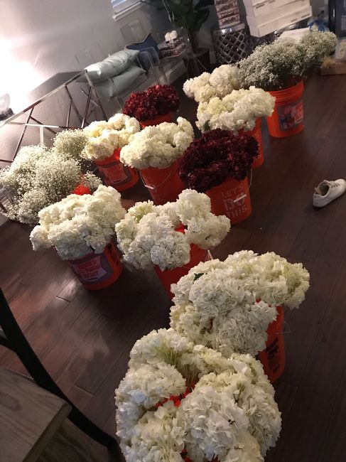I was going to do faux flowers and greenery but I checked sam's club prices and they were so reasonable! A local florist said she'll do my flowers for $15 an hour which she said would take 3-4 hours. So I have 150 white hydrangeas, 26 Burgundy...