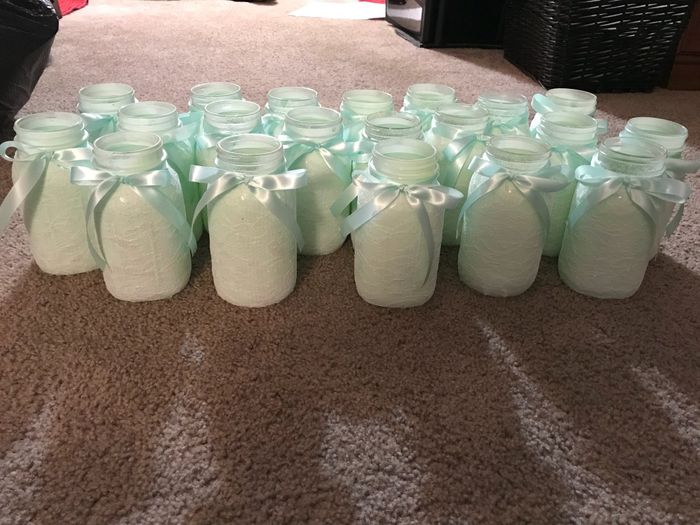 2718 days agoI just finished these. They are going to be my vases for the centerpieces. They are mason jars I got at goodwill for $0.50 a piece. Spray painted them mint green, glued lace over that, and finished it off with a mint green ribbon. There was 20...