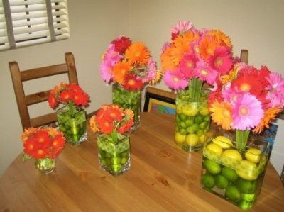 Im doing these centerpieces but mines will have apple, oranges, and tangerines, with red, orange and yellow flowers...how would you place them on your tables...a differente size on each table or two on table...also how wide do you thing the bigger...