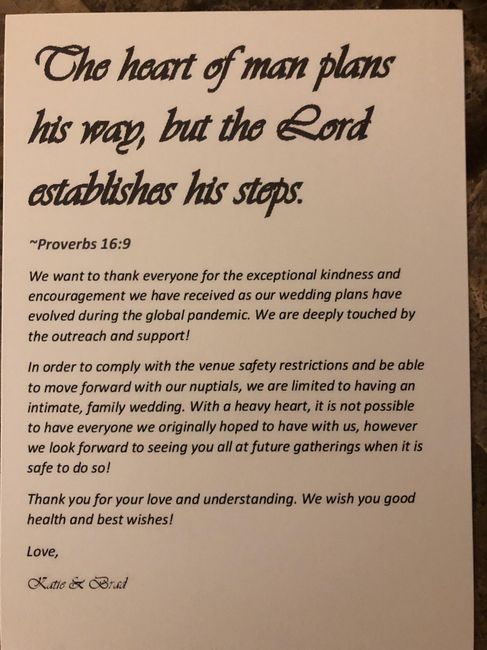 Our wedding is May 15th and our venue let us know that we could proceed, but we will need to cut our guest list down to 100 people. We were originally expecting 160. Can you ladies show me examples of a un-invite card you've sent out?