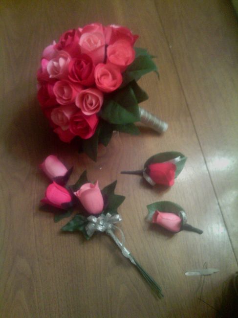 The first pic is what I originally made. I wondered if the headband was too much silver, and you ladies agreed. 2nd pic is the redo... and FH's daughter will be carrying 3 roses I think it's much better...do you? Do you think I need a touch of...