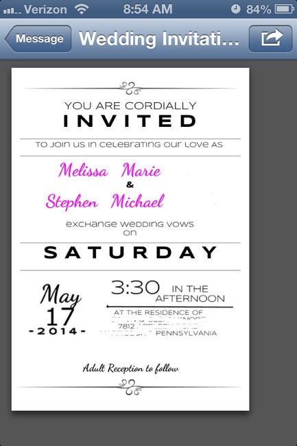 picture #1 is a sample of what I saw online (minus purple envelopes, using fuchsia). picture #2 is my attempt at recreating it on the computer...did not print out or add ribbon to the invitation yet. Picture #3 is a sample of what I thought was cute...