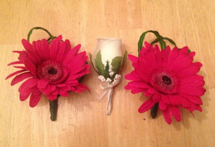 Here are the bouquets I made. I have one more to make. I bought my silk flowers from eBay. The lady I bought them from custom made my boutonnières from the same flowers so they would match. My bouquet has my grandmother's blue sapphire charm on it...