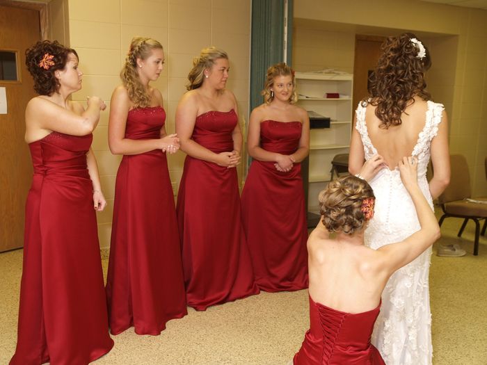 so i keep seeing pictures of bridal parties helping the bride get dressed and ready and while it's cute, i cringe at the idea of people "dressing me" thats just really friggin odd. im pretty dead set on getting myself ready the day of the wedding,...