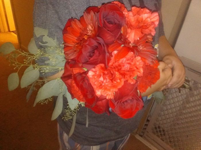 Here it is, roses, carnations, Gerber, and eucalyptus. Whatcha think? The Carnations kept breaking so there's less flowers than I wanted, so the real thing will definitely be more full. Still deciding on whether to cradle or not, since there is so...